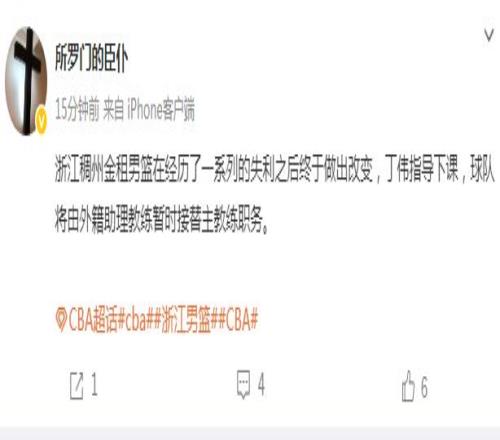 媒体人所罗门的臣仆报道:“浙江稠州金租男篮在经历一系列的失利之后,终于做出改变,丁伟指导下课,球队将由外籍助理教练暂时接替主教练职务。”