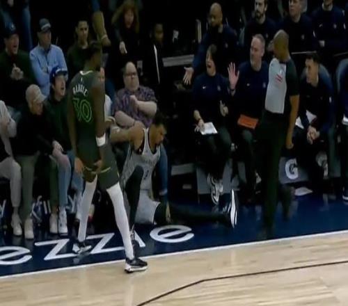 还有一个回合,文班被兰德尔逼到了边线,最终直接倒在场外,裁判没有吹犯规而是吹了马刺出界。